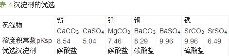 由表 4可知,對鈣、鎂、鍶離子可選擇可溶性碳酸鹽作為沉淀劑,對于鋇離子則應(yīng)使用硫酸鈉作為沉淀劑。綜合考慮處理效果、操作難易程度和成本因素,最終選擇使用碳酸鈉作為沉淀劑。