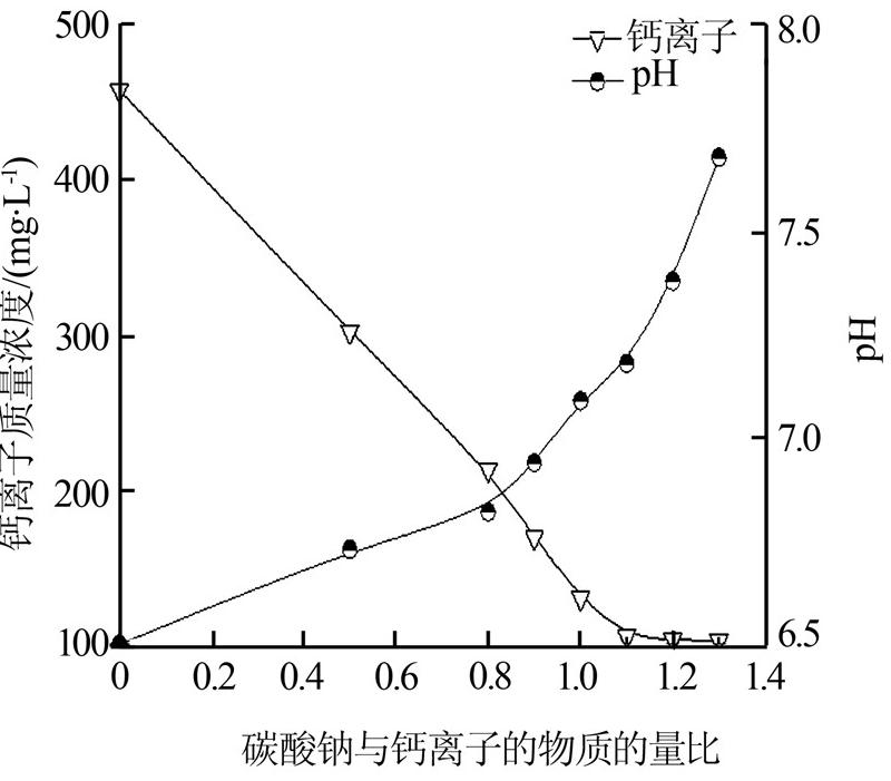 由圖 2可知,當碳酸鈉與鈣離子的物質(zhì)的量比為1.0時,水中鈣離子質(zhì)量濃度可從原有的458 mg/L降低到130 mg/L;當碳酸鈉與鈣離子的物質(zhì)的量比為1.1~1.2時,水中剩余鈣離子質(zhì)量濃度在100mg/L左右,該濃度對處理后水回用于配制壓裂液幾乎沒有影響。因此,確定碳酸鈉按照水中鈣離子物質(zhì)的量的1.1~1.2倍加入。碳酸鈉在廢水處理中不僅能調(diào)節(jié)酸堿度,而且可以去除結(jié)垢性離子,降低碳酸鈣結(jié)垢趨勢。