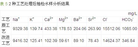 根據(jù)室內(nèi)研究的改進工藝,不需增加水處理設(shè)備,化學(xué)沉淀步驟在返排液混凝罐中進行。即向氧化處理后的壓裂返排液中加入碳酸鈉調(diào)節(jié)廢水pH為中性,然后加入混凝劑、助凝劑攪拌均勻,再依據(jù)廢水中鈣的物質(zhì)的量,加入1.1~1.2倍物質(zhì)的量的碳酸鈉,攪拌溶解,使結(jié)垢性離子鈣、鎂、鍶與碳酸根充分反應(yīng)形成沉淀物。形成的細小沉淀物可借助絮凝的作用加速沉降。改進工藝于2014年2月現(xiàn)場運行,持續(xù)時間半年以上。運行結(jié)果表明,緩沖罐中結(jié)垢量明顯減少,凈水罐中無結(jié)垢現(xiàn)象;而且出水擱置0、72、96 h時,水的透光率均在98%以上,沒有出現(xiàn)乳白狀現(xiàn)象。凈水罐中抽檢水樣分析數(shù)據(jù)見表 5。具體參見http://wlmqsb.com更多相關(guān)技術(shù)文檔。