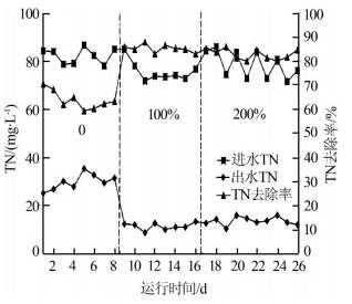 在混合液內(nèi)回流比分別為0、100%和200%的情況下,分段進水循環(huán)A/O工藝對TN的去除效果如圖 4所示。
