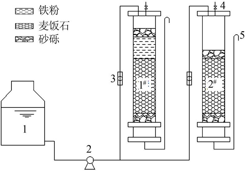 采用2個(gè)內(nèi)徑55 mm、高450 mm的有機(jī)玻璃管作為土柱反應(yīng)器(分別記為1#柱、2#柱),柱子上下兩端各裝填20 mm高、粒徑為5~10 mm的砂礫保護(hù)層。1#柱在砂礫保護(hù)層之間由下往上依次裝填高200 mm、粒徑0.25~0.60 mm的麥飯石及高100 mm、粒徑0.60~2.0 mm的鐵屑,2#柱在砂礫保護(hù)層之間僅裝填與1#柱等量的麥飯石。各柱的出水口均高出柱內(nèi)填料上表面約30 mm,避免柱內(nèi)形成短流。試驗(yàn)過程中用流量計(jì)控制水力負(fù)荷為0.1 m3/(m2·d).試驗(yàn)裝置見圖 1。