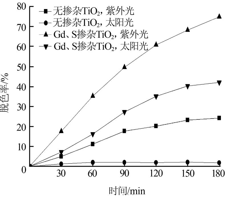 由圖 1可知,對于無摻雜TiO2,在可見光照射下,脫色率很低,可以忽略不計。對于摻雜釓0.2%、硫1.0%的TiO2試樣,在可見光下有較為明顯的效果,說明釓、硫共摻雜產生協(xié)同效應降低了半導體禁帶寬度,擴展了TiO2的光響應范圍,改善了TiO2的光催化性能。TiO2中摻雜的Gd3+還可以作為一種電子捕獲劑〔14〕,促進表面氧空穴的形成,非金屬摻雜后在價帶上方形成了一個新的能級,使二氧化鈦的帶隙變窄,從而能夠吸收更多的可見光,提高光催化的效率。而在紫外燈下,釓、硫共摻雜TiO2的光催化效果明顯提高,紫外照射3 h后,對大紅染料的脫色率達到了74.8%,相對無摻雜TiO2提高了50.6%。