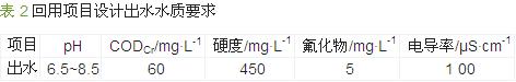 針對企業(yè)含氟廢水水質(zhì)特點(diǎn),決定將準(zhǔn)備回用處理的含氟廢水處理后回用到純水站代替新鮮水制備純水供應(yīng)到生產(chǎn)中,回用處理系統(tǒng)濃水排到原有除氟處理設(shè)施處理達(dá)標(biāo)后排放。回用水質(zhì)需滿足《城市污水再生利用 工業(yè)用水水質(zhì)》(GB/T 19923—2005)表 1中工藝與產(chǎn)品用水的水質(zhì)標(biāo)準(zhǔn)要求,同時滿足特征指標(biāo)氟化物質(zhì)量濃度低于5 mg/L、電導(dǎo)率低于100 μS/cm的要求。本項(xiàng)目設(shè)計(jì)出水水質(zhì)要求見表 2。