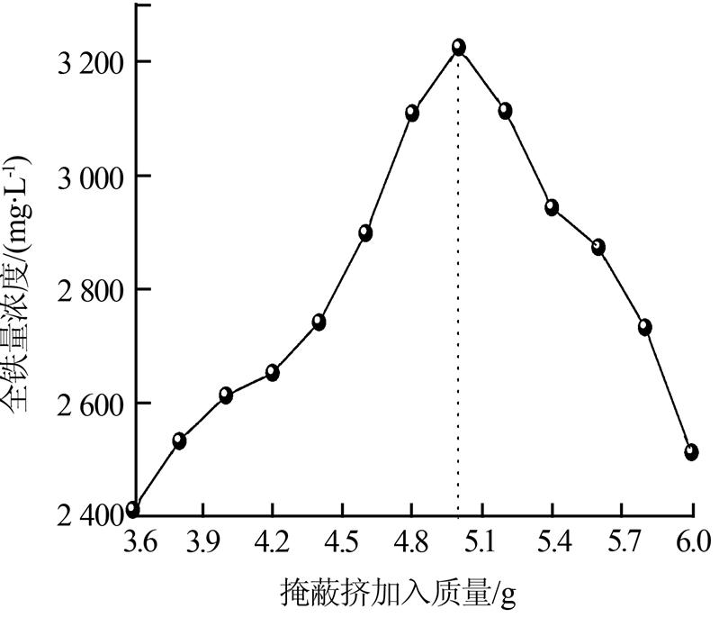 由圖 3可知,隨著掩蔽劑添加量的增加,全鐵測定質(zhì)量濃度呈現(xiàn)先增后減的趨勢。掩蔽劑添加質(zhì)量在3.6~5.0 g時,測定值呈上升趨勢,并在掩蔽劑添加質(zhì)量為5.0 g時達(dá)最大值,隨后呈現(xiàn)總體下降趨勢。因此,廢液中Mg2+濃度較高,掩蔽劑添加質(zhì)量宜選5.0 g。