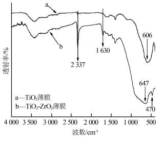 利用Nexus 470型紅外光譜測(cè)試儀對(duì)Ti2薄膜與Ti2-ZrO2薄膜進(jìn)行紅外光譜測(cè)試,結(jié)果如圖 1所示。