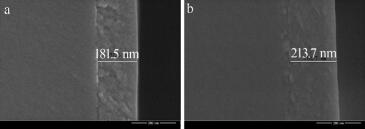 使用JEM-2100F型掃描電子顯微鏡對(duì)Ti2薄膜以及Ti2-ZrO2薄膜的斷面進(jìn)行了考察,結(jié)果如圖 2所示。