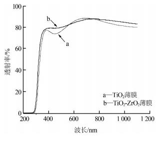 使用CARY500型紫外可見近紅外分光光度計(jì),于25 ℃下,在190~1 100 nm的波長(zhǎng)范圍內(nèi)對(duì)Ti2薄膜以及Ti2-ZrO2薄膜進(jìn)行透射率測(cè)試,結(jié)果如圖 3所示。