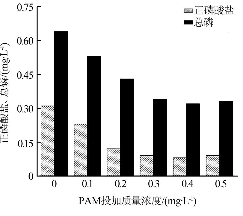 從圖 5可以看出,當PAM投加質量濃度為0.3 mg/L,經沉淀后總磷質量濃度可降低至0.4 mg/L以下,正磷酸鹽質量濃度降低至0.1 mg/L以下。當PAM投加質量濃度大于0.3 mg/L,總磷和正磷酸鹽濃度變化趨勢不明顯。從實驗現(xiàn)象可以看出,與不加PAM相比,加入PAM后形成的絮體體積更大,沉淀時間減少。但是,過多加入PAM,不僅會增加廢水處理藥劑費用,同時還會增加水體COD〔11〕。因此,實驗確定PAM的最佳投加質量濃度為0.3 mg/L。