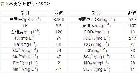 選取華北地區(qū)天津某工廠的現(xiàn)場循環(huán)冷卻系統(tǒng)進水為測試水樣,經(jīng)活性炭和精濾去除雜質(zhì)后,測定水質(zhì)情況,見表 2。