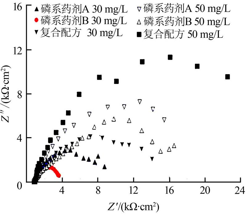 (2)復(fù)合配方的電化學(xué)測試研究。采用電化學(xué)阻抗法對酰胺類無磷緩蝕劑復(fù)合配方進行測試,并與市售磷系藥劑商品進行對比,根據(jù)失重法(旋轉(zhuǎn)掛片法)結(jié)果選取30、50 mg/L兩個投加量進行電化學(xué)測試,結(jié)果如圖 4所示。