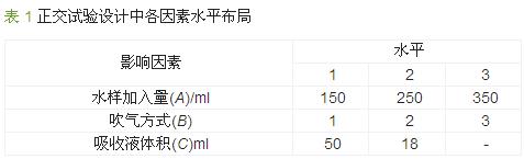 從表 2可以看出,因子A水樣加入量的R值較大,即加入水量的多少會(huì)顯著影響回收率,其中 1> 2> 3,故水樣加入量?jī)?yōu)先選擇150 mL;B因子對(duì)測(cè)定也有一定影響,由于 1> 3> 2吹氣方式選1;C因子對(duì)回收率的影響相對(duì)較弱,因 1> 2,吸收液量選取50 mL。按極差分析得出的優(yōu)化方案為A1B1C1即第9組試驗(yàn),其回收率為113.6%>>100%,可推測(cè)其受外界干擾因素較多,不符合優(yōu)化條件的選擇。由于顯著影響因子A的水平1、2的 相差較小,并且實(shí)驗(yàn)發(fā)現(xiàn)組合為A2B1C1時(shí)平均回收率為99.7%(n=6,RSD=5.63%),綜合考慮后選取A2B1C1為最優(yōu)條件。