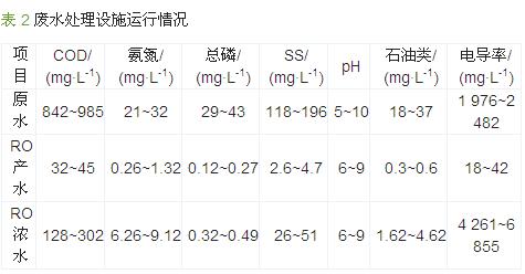 脫脂廢水、磷化廢水、噴漆廢水和電泳廢水等機械加工廢水的有機物濃度較高,且含有礦物油、懸浮物和氮磷等污染物。通過氣浮和混凝沉淀處理可將COD降低到700 mg/L左右,生物系統(tǒng)(缺氧和好氧工藝)可將COD降低到70 mg/L左右,出水可穩(wěn)定達標排放。實際運行時首先投加NaOH將廢水pH調(diào)至8.5~9.0,然后按照3、5、1.0 mL/L的投加量分別加入5%(質(zhì)量分數(shù),下同)的CaCl2溶液、10%的聚合氯化鋁和5%的聚丙烯酰胺溶液,混合反應(yīng)60 min后進入氣浮池,氣浮出水按6、1.5 mL/L投加量分別投加10%的聚合氯化鋁和5%的聚丙烯酰胺溶液,混凝沉淀出水最后進入生物處理系統(tǒng),生化出水經(jīng)砂濾器、炭濾器、超濾、保安過濾器和反滲透深度處理后回用于生產(chǎn),反滲透濃水可達到GB 8978—1996三級標準。該工程已穩(wěn)定運行4 a多,從實際檢測結(jié)果來看,反滲透產(chǎn)水COD穩(wěn)定在32~45 mg/L,電導(dǎo)率穩(wěn)定在18~42 μS/cm,可滿足生產(chǎn)用水水質(zhì)要求;反滲透濃水COD穩(wěn)定在128~302 mg/L,SS穩(wěn)定在26~51 mg/L,達到GB 8978—1996三級標準后達標排放,其主要水質(zhì)指標如表 2所示。具體參見http://wlmqsb.com更多相關(guān)技術(shù)文檔。