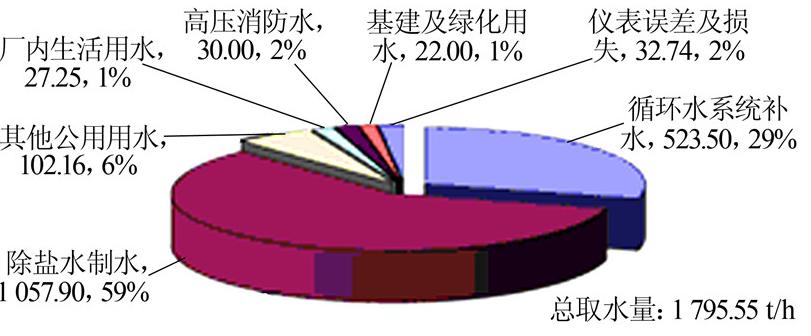 選取西北某煤化工企業(yè)進(jìn)行冬、夏兩季水平衡測試。冬季新鮮水總用水量為1 795.55 t/h,單位產(chǎn)品取水量為24.38 t/t; 夏季新鮮水總用量為2 725.00 t/h,單位產(chǎn)品取水量為36.54 t/t。新鮮水用水過程包括循環(huán)水系統(tǒng)補(bǔ)水、除鹽水制水、其他工藝用水過程、廠內(nèi)生活用水、高壓消防水、基建及綠化、儀表誤差及損失。冬、夏兩季的用水過程所占新鮮水比例如圖 1、圖 2所示。從圖中可以看出,除鹽水制水和循環(huán)水系統(tǒng)補(bǔ)水所占比例較大。
