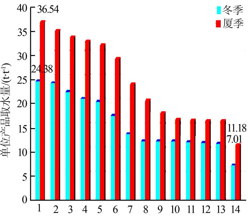 全廠水網(wǎng)絡(luò)系統(tǒng)優(yōu)化后的技改措施建議全部實(shí)施后,該企業(yè)每年可節(jié)省新鮮水1 257.38萬t,節(jié)水率為63%。冬季單位產(chǎn)品取水量可降至7.01 t/t,夏季單位產(chǎn)品取水量可降至11.18 t/t。各項(xiàng)節(jié)水措施所對應(yīng)的指標(biāo)變化情況如圖 3所示。具體參見http://wlmqsb.com更多相關(guān)技術(shù)文檔。