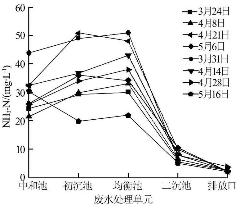 均衡池出水中平均NH3-N高達(dá)37.5 mg/L,這對后續(xù)好氧生物處理非常有利。至二沉池,NH3-N濃度下降很低,至排放口,平均NH3-N已降至2.5 mg/L,優(yōu)于新國標(biāo)小于12 mg/L的要求。