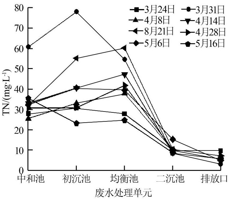 圖4顯示了各處理單元廢水的TN含量,其變化趨勢和NH3-N很相似,從中和池至初沉池、均衡池,TN呈上升趨勢,這同樣可能是廢水中含氮高分子在水解菌作用下被逐步釋放出來的原因,具體機(jī)理有待和TN一并研究。至二沉池,TN濃度下降很低,至排放口,平均TN已降至6.0 mg/L,優(yōu)于新國標(biāo)小于15 mg/L的要求。按照廢水好氧生物處理原理,C/N為40是合理的,本研究中均衡池出水平均COD為1 581 mg/L,平均TN為41.8 mg/L,恰好符合這一比值。因此,后續(xù)好氧池完全可省去現(xiàn)行加尿素的工序,既簡化了操作流程,又節(jié)約了營養(yǎng)鹽等費(fèi)用。