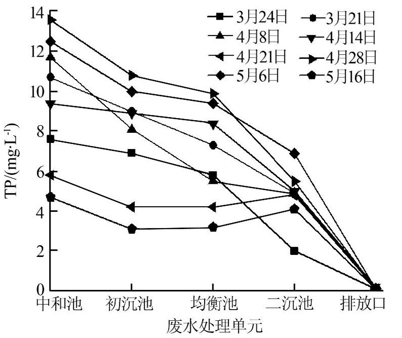 圖5顯示了各處理單元廢水的TP含量,從中和池、初沉池、均衡池、二沉池至排放口,TP呈下降趨勢。中和池廢水8周測定的平均TP為9.5 mg/L,在排放口出水時平均TP已降至0.1 mg/L,完全滿足新國標(biāo)小于0.5 mg/L的要求。