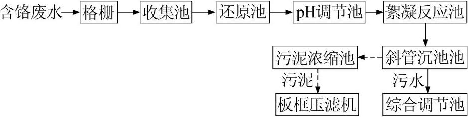 格柵采用316L特種防腐材質(zhì),柵隙3 mm;收集池有效容積300 m3,停留時(shí)間14 h,池內(nèi)設(shè)置316L材質(zhì)特種泵2臺,1用1備;還原池有效容積50 m3,停留時(shí)間2 h,pH調(diào)節(jié)池和絮凝反應(yīng)池有效容積均為25 m3,停留時(shí)間1 h,斜管沉淀池有效容積75 m3,停留時(shí)間3 h,表面負(fù)荷0.8 m3/(m2·h);污泥濃縮池采用豎流式重力濃縮方式,有效容積50 m3,固體負(fù)荷30 kg/(m2·h),配套G40污泥螺桿泵2臺,80 m2板框壓濾機(jī)1臺,加藥設(shè)備4套。