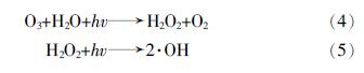 紫外光的存在可以增加單位溶液的能量密度,產(chǎn)生更多的有效光子〔7〕,使COD去除率明顯優(yōu)于無紫外光條件。實(shí)驗(yàn)結(jié)果表明,當(dāng)光照時(shí)間為0~15 min時(shí),隨著光照時(shí)間的增加,COD去除率顯著提升。這是因?yàn)閁V本身具有直接氧化有機(jī)物的功能,同時(shí)可與水中O3發(fā)生如下反應(yīng):