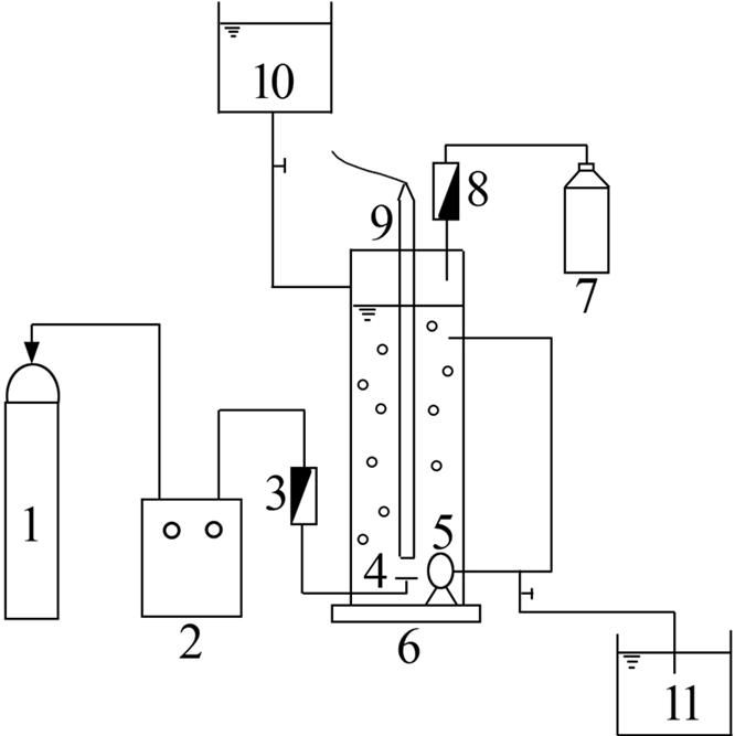 1-氧氣瓶;2-臭氧發(fā)生器;3-氣體流量計(jì);4-曝氣頭;5-循環(huán)泵;6-AOPs反應(yīng)器;7-雙氧水罐;8-液體流量計(jì);9-紫外燈;10-進(jìn)水水箱;11-出水水箱