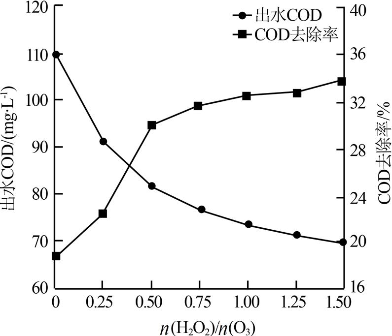 過量的H2O2消耗了水中的·OH,且產(chǎn)生的·HO2對有機(jī)物的氧化作用很小,導(dǎo)致COD去除率變化甚微。選擇最佳n(H2O2)/n(O3)為0.5。