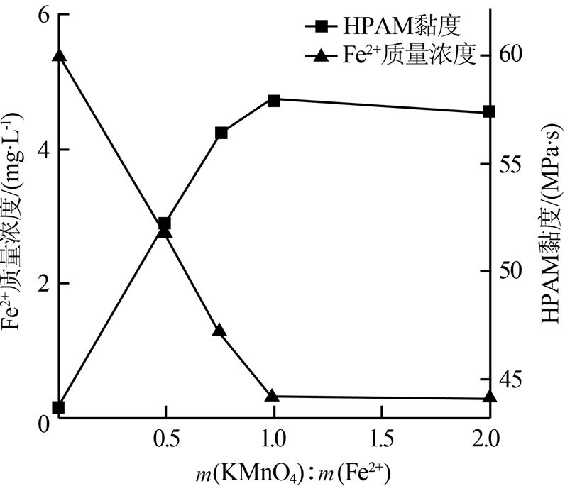 由圖 4可見,m (KMnO4):m (Fe2+)為0~1.0時(shí),隨 m (KMnO4):m (Fe2+)的增加,Fe2+的濃度迅速下降,相應(yīng)的HPAM黏度也大幅提升。當(dāng)m (KMnO4):m (Fe2+)為1時(shí),Fe2+的去除率達(dá)到94%,此時(shí)HPAM的黏度為57.9 MPa·s,已恢復(fù)到不含F(xiàn)e2+的HPAM溶液黏度(57.6 MPa·s),此時(shí)黏度恢復(fù)率為32.5%。繼續(xù)投加KMnO4,Fe2+的濃度趨于穩(wěn)定,HPAM黏度增幅不大。由此可見,當(dāng)m (KMnO4):m (Fe2+)為1時(shí),Fe2+的去除效果最好,得到的聚合物黏度也最高。