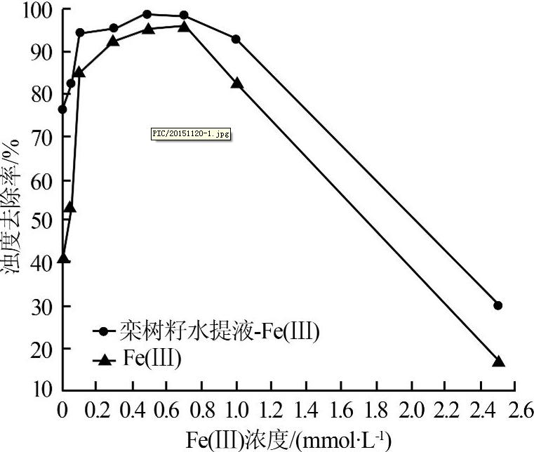 不改變溫度及pH,向100 mL、0.5 g/L的高嶺土懸濁液中加入0.5 mL質(zhì)量濃度為5 g/L的欒樹籽水提液,改變Fe(Ⅲ)的濃度(分別為0.01、0.05、0.1、0.5、0.7、1.0、2.5 mmol/L),并與只加入硫酸鐵的絮凝試驗(yàn)進(jìn)行對(duì)照,結(jié)果如圖1所示。
