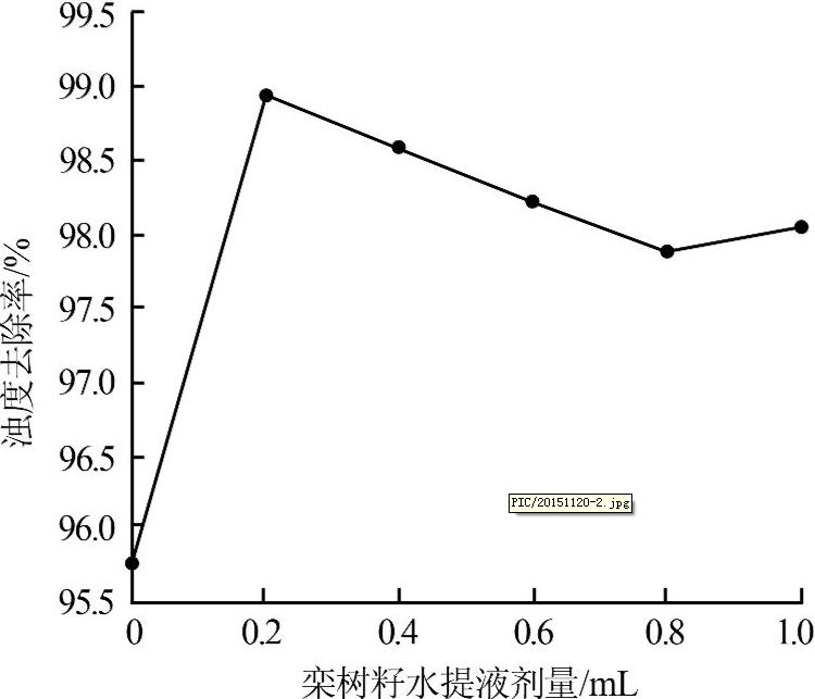 由圖2可知,隨著欒樹籽水提液劑量的變化,濁度去除率先上升,后下降。但總體水平均很高。當(dāng)5 g/L欒樹籽水提液的投加量為0.2 mL時(shí),濁度去除率達(dá)到99%。因此,欒樹籽水提液的最佳劑量為 0.2 mL。