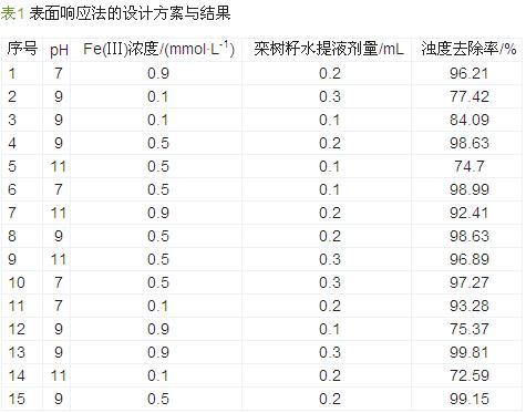 前期實(shí)驗(yàn)表明,欒樹籽水提液具有一定的絮凝活性,但是絮凝效果不是十分明顯。因此將欒樹籽水提液與不同金屬離子混合對(duì)其進(jìn)行一定的改性,發(fā)現(xiàn)加了金屬離子后的欒樹籽水提液的絮凝效果顯著增加,且欒樹籽與Fe(Ⅲ)復(fù)配時(shí)絮凝效果最好,Al(Ⅲ)次之,其他的金屬離子也有一定的助凝效果,但不明顯。說(shuō)明加入Al(Ⅲ)和Fe(Ⅲ)可以大幅改善欒樹籽的絮凝活性,本研究中,考慮到鋁鹽的毒害作用,選擇Fe(Ⅲ)對(duì)欒樹籽進(jìn)行改性,考察影響欒樹籽-Fe(Ⅲ)絮凝劑絮凝性能的4個(gè)因素,即Fe(Ⅲ)濃度、欒樹籽水提液劑量,pH、溫度。在此基礎(chǔ)上,利用響應(yīng)面法,對(duì)絮凝過(guò)程進(jìn)行優(yōu)化,確定最優(yōu)改性條件。