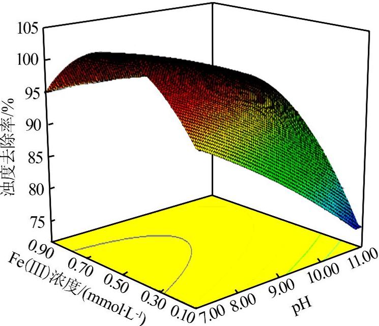 圖5 pH與Fe(Ⅲ)濃度對(duì)絮凝交互影響的三維曲面