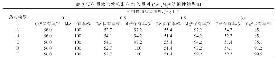 為驗證低劑量水合物抑制劑對油田污水結(jié)垢性的影響,按表1 配制強結(jié)垢型的油田污水,并添加質(zhì)量分數(shù)為0.5%~3%低劑量水合物抑制劑進行試驗,結(jié)果見表2。試驗表明,對于具有較強結(jié)垢趨勢的油田水質(zhì),加入水合物抑制劑后,Ca2+的保有率比空白稍有下降,但不顯著,即水合物抑制劑的加入對油田污水碳酸鈣垢的沉積不會造成太大的影響。除了E外, 隨著A~D 水合物抑制劑用量增加,Mg2+的保有率有不同程度的下降, 表現(xiàn)出對油田污水中Mg2+的沉積有一定的促進作用。