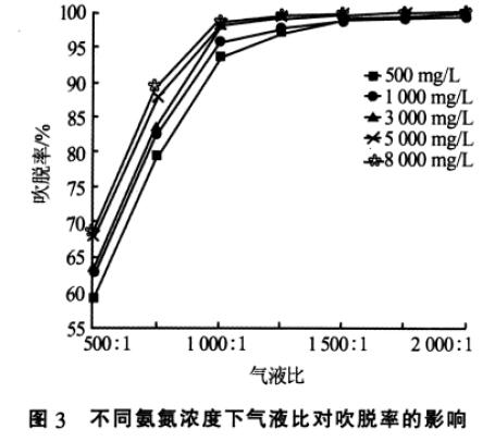 由圖3 可知,氣液比小于1 000∶1 時(shí),不同氨氮濃度廢水的吹脫率均隨氣液比的增加顯著提高;但氣液比達(dá)到1 000∶1 時(shí), 氨氮質(zhì)量濃度≥3 000 mg/L以上的廢水吹脫率可達(dá)95%以上; 繼續(xù)提高氣液比,吹脫率增加緩慢;而氨氮質(zhì)量濃度<3 000 mg/L的廢水吹脫率接近95%,繼續(xù)提高氣液比至1 500∶1后,吹脫率可達(dá)95%以上且增加緩慢。這表明,氣液比超過(guò)1 000∶1 后, 進(jìn)水氨氮濃度對(duì)吹脫率影響不大。實(shí)驗(yàn)中為獲得95%以上的吹脫率,應(yīng)根據(jù)進(jìn)水氨氮濃度將氣液比控制在(1 000~2 000)∶1 的范圍。