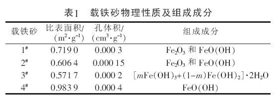1#、2# 載鐵砂均為Fe2O3和FeO(OH)的混合物,但二者的區(qū)別在于其中的FeO(OH) 的晶型分別為α 型和β 型。4# 載鐵砂為α-FeO (OH) 和β -FeO(OH)的混合物。由于3# 載鐵砂為濕潤(rùn)狀態(tài)下的鐵質(zhì)濾膜,無(wú)法滿足XRD 需在干燥狀態(tài)下測(cè)定的條件,因此不能直接進(jìn)行組成分析。而利用熱差和熱天平分析, 得到3# 載鐵砂濾膜的化學(xué)組成為[mFe(OH)3+(1-m)Fe(OH)2]·2H2O(m 為濾膜中三價(jià)鐵所占比例), 其中3# 載鐵砂中三價(jià)鐵占70%~90%, 二價(jià)鐵占2%~30%〔8〕。1#~4# 載鐵砂的比表面積、孔體積及成分組成見(jiàn)表1。