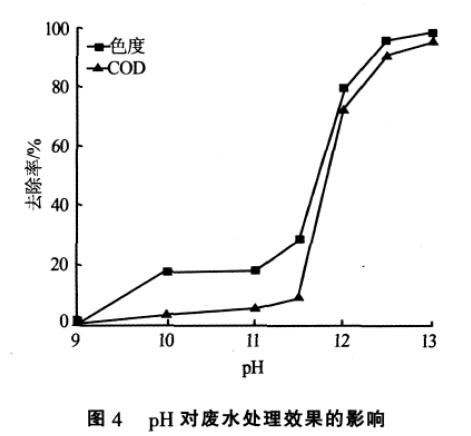 實(shí)驗(yàn)進(jìn)一步考察了使用CaO-MgSO4·7H2O 復(fù)合絮凝劑處理該染料廢水時(shí)pH 的變化對(duì)處理效果的影響,結(jié)果見圖4。