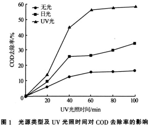 取微電解處理后的水樣, 調(diào)節(jié)pH=5,TiO2加入量40 mL/L,分別于紫外光、日光和無光條件下,考察COD 去除率隨時間的變化,結(jié)果見圖1。
