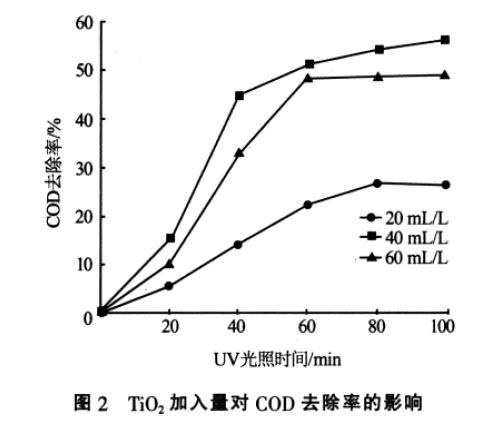 由圖2 可知,TiO2加入40 mL/L 時COD 去除率最高。這是因為增加TiO2加入量, 相當于增加了TiO2有效接觸面積,促進了氧化還原反應的進行,但由于納米級的TiO2顆粒表面活性高,繼續(xù)增加加入量,使其碰撞幾率增加,易團聚長大,反而導致有效表面積減少,同時遮蔽了入射光線,阻礙紫外光到達TiO2顆粒表面,降低了催化效率,因此TiO2的加入量要適宜,本實驗的適宜TiO2加入量為40 mL/L。