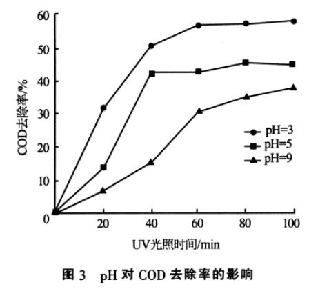 用鹽酸和氫氧化鈉溶液調(diào)節(jié)進水水樣pH,加入40 mL/L TiO2, 考察在不同pH 條件下,COD 去除率隨時間的變化,結(jié)果見圖3。