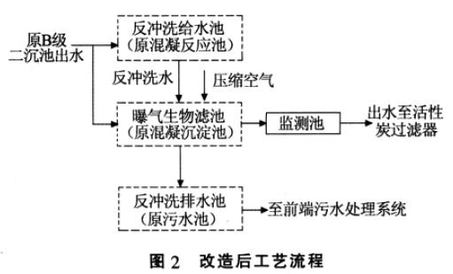 為不影響污水場的正常生產(chǎn),本改造工程通過對污水場現(xiàn)有工藝流程和運(yùn)行情況的認(rèn)真分析,在原有工藝流程的基礎(chǔ)上,將原混凝沉淀池改為曝氣生物濾池,并對曝氣生物濾池的結(jié)構(gòu)形式和濾料級配進(jìn)行優(yōu)化設(shè)計(jì),充分發(fā)揮其生物反應(yīng)功能和過濾功能,實(shí)現(xiàn)COD、懸浮物等污染物質(zhì)的去除。鑒于場地緊張,本工程的工藝流程設(shè)計(jì)全部利用已有構(gòu)筑物,設(shè)備亦盡可能利舊。改造后的工藝流程見圖2。