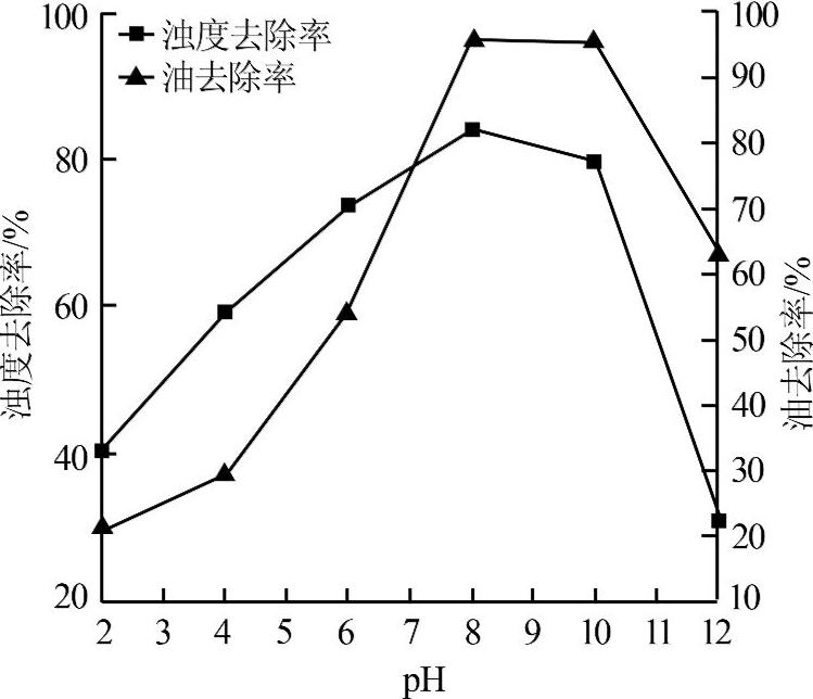 由圖2可以看出,隨著pH的增大,溶液濁度去除率和油含量去除率都是先升高再降低,在pH為8時(shí),絮凝效果最好。pH過(guò)小時(shí),體系中存在大量的Al3+,一方面大量的Al3+會(huì)使體系中顆粒帶上正電荷,電荷排斥作用會(huì)使體系再次處于穩(wěn)定狀態(tài);另一方面,Al3+會(huì)對(duì)溶液中的陽(yáng)離子共聚物有排斥作用,使陽(yáng)離子共聚物鏈有收縮趨勢(shì),減小了其在溶液中的有效粒徑,不利于絮凝的進(jìn)行。當(dāng)pH 過(guò)大時(shí),溶液中的OH-會(huì)明顯降低陽(yáng)離子絮凝劑的Zeta 電位,不利于中和油田采出水中膠團(tuán)所帶的負(fù)電荷,同樣不利絮凝劑的絮凝作用。由此可知,對(duì)于大慶油田含聚污水的絮凝處理最佳條件為pH=8。