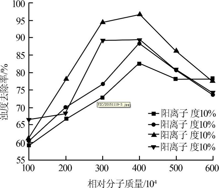 圖3 陽(yáng)離子度及分子質(zhì)量對(duì)濁度去除率的影響