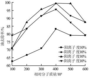 圖4 陽(yáng)離子度及分子質(zhì)量對(duì)油含量去除率的影響