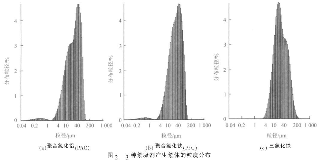 由圖2 可以看出,3 種絮凝劑所產(chǎn)生絮體的粒徑均在40 μm 左右,PAC 和PFC 在粒徑<2 μm 部分有少量絮體分布,這一點(diǎn)也印證了上述實(shí)驗(yàn)現(xiàn)象。根據(jù)Stokes 滯留區(qū)公式計(jì)算推導(dǎo)得出,絮體的有效密度取決于絮凝體中有機(jī)質(zhì)的含量、絮凝體的含水率、絮凝體的空隙度、絮凝的強(qiáng)度、水體的紊動(dòng)強(qiáng)度等。因此,在相同混凝條件下所產(chǎn)生的絮體可視為有效密度相同。絮體的沉降速度與粒徑的平方成正比,因此,粒徑分布集中,更有利于沉降,避免難以沉降的懸浮絮體給出水水質(zhì)帶來(lái)影響。