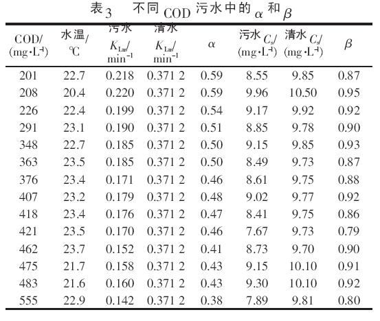 根據(jù)實(shí)測(cè)的清水與不同COD 污水中KLas和Cs數(shù)據(jù), 計(jì)算污水中的清污修正系數(shù)α、β, 結(jié)果見(jiàn)表3。