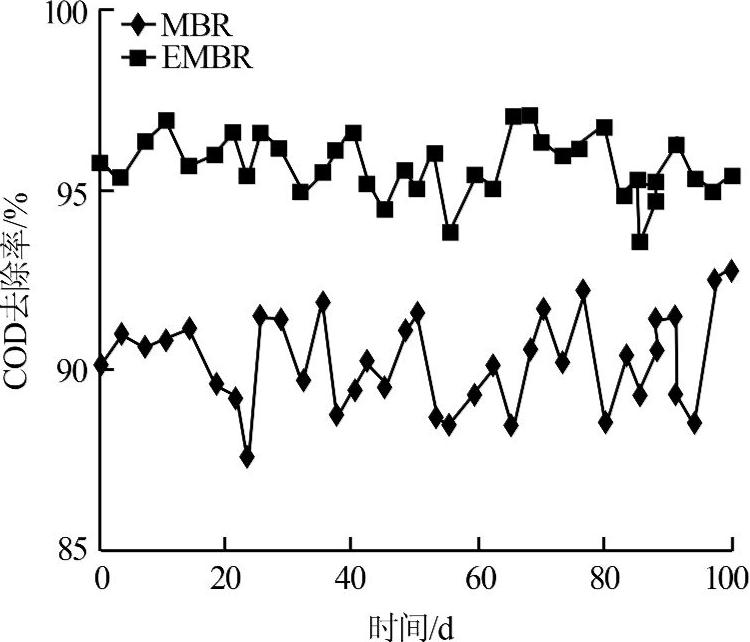 試驗期間MBR和EMBR對COD的去除效果均較為穩(wěn)定,其中MBR對COD的去除率介于87.3%~92.8%,平均去除率為90.2%,EMBR對COD的去除率介于93.2%~97.2%,平均去除率為95.7%,可見EMBR對COD的去除效果明顯優(yōu)于MBR(見圖2)。
