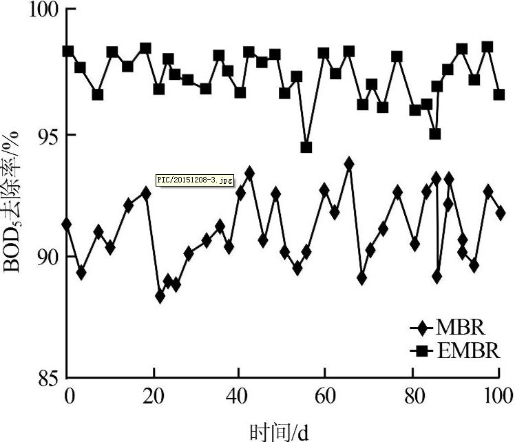 生活污水的可生化性較好,試驗期間MBR和EMBR對BOD5均表現(xiàn)出良好的去除效果,且去除效果均較為穩(wěn)定。其中MBR對BOD5的去除率介于88.2%~93.8%,平均去除率為91.1%,而EMBR對BOD5的去除率介于94.1%~98.8%,平均去除率為97.3%。很明顯,EMBR能夠在MBR的基礎(chǔ)上進一步去除生活污水中的BOD5(見圖3)。