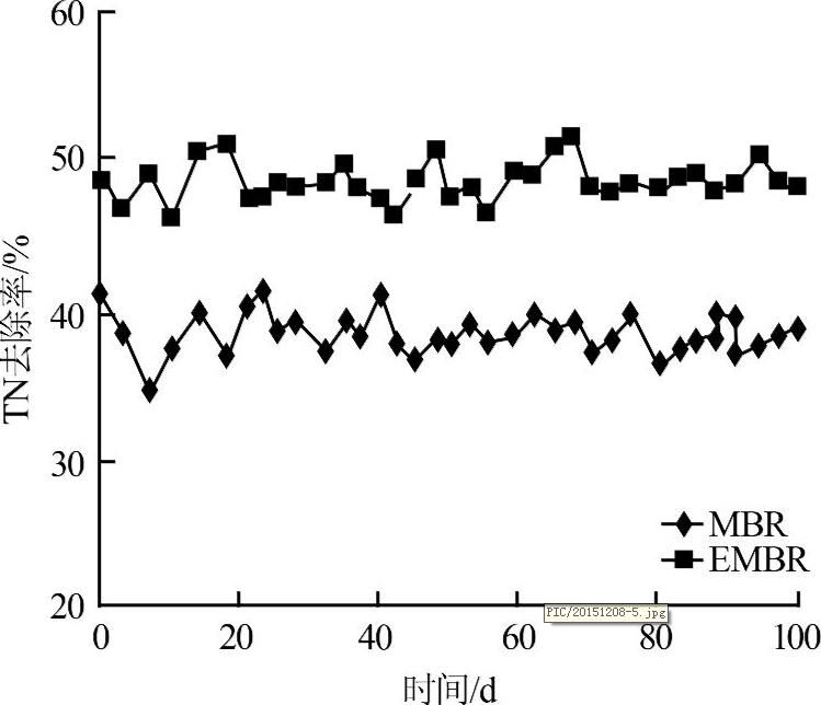 由圖5可知,MBR對TN的平均去除率僅為38.6%,脫氮效果較差,而EMBR對TN的平均去除率為48.7%,取得了較好的脫氮效果。