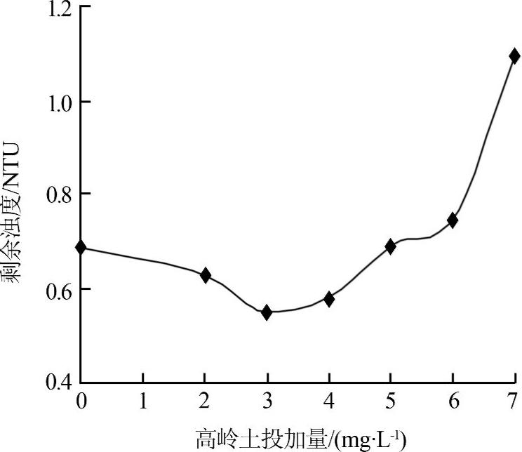 為提高FeCl3的絮凝效果,采用當(dāng)?shù)爻R姷母邘X土作為助凝劑。試驗(yàn)條件:水樣初始濁度為2.21 NTU,水溫18 ℃,pH調(diào)至8.03,F(xiàn)eCl3投加量為3.6 mg/L。改變高嶺土投加量進(jìn)行試驗(yàn),取上清液測定剩余濁度,測定結(jié)果如圖1所示。