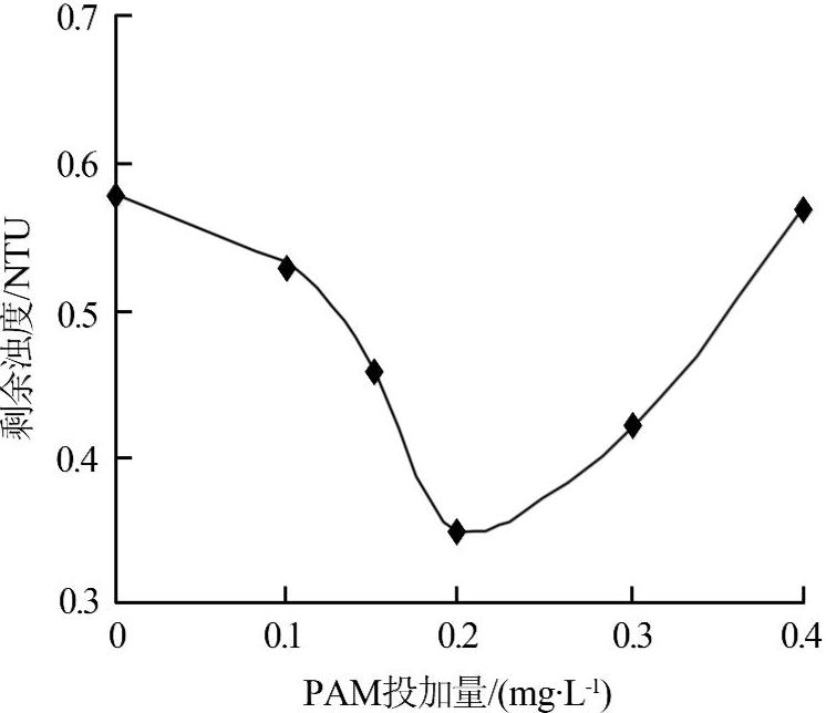 試驗(yàn)條件:水樣初始濁度為2.72 NTU,水溫18 ℃,pH調(diào)至8.0,F(xiàn)eCl3投加量為3.6 mg/L。以PAM為助凝劑,其投加量為0.1~0.4 mg/L,測定上清液的剩余濁度,結(jié)果如圖3所示。