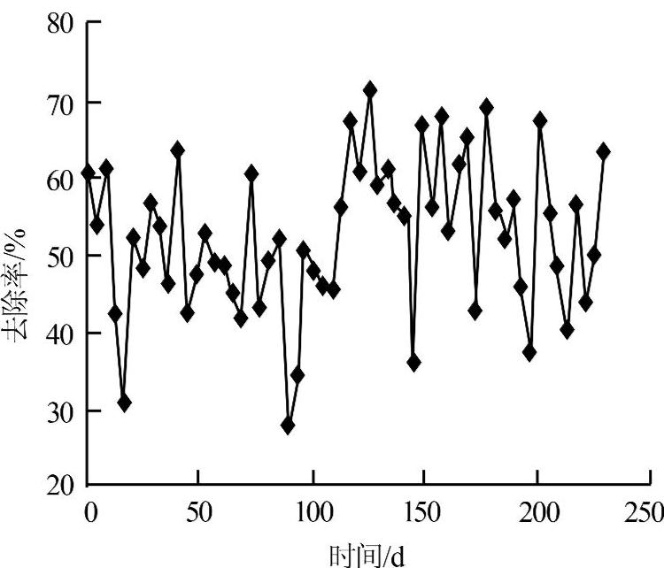 由圖1可知消泡劑TS-104對(duì)生化好氧系統(tǒng)的COD去除效果不造成影響。