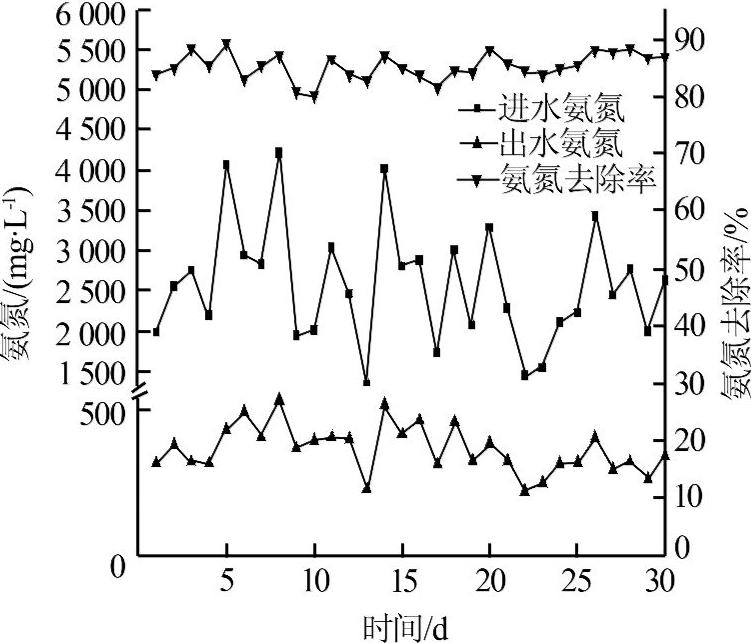 圖3 MAP 反應(yīng)沉淀池1 對氨氮的去除效